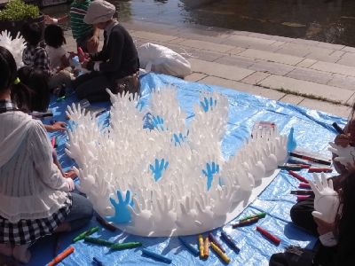 一家族が1色を担当して写真をとり、色毎に写真を並べ、その写真で虹を作るワークショップ。